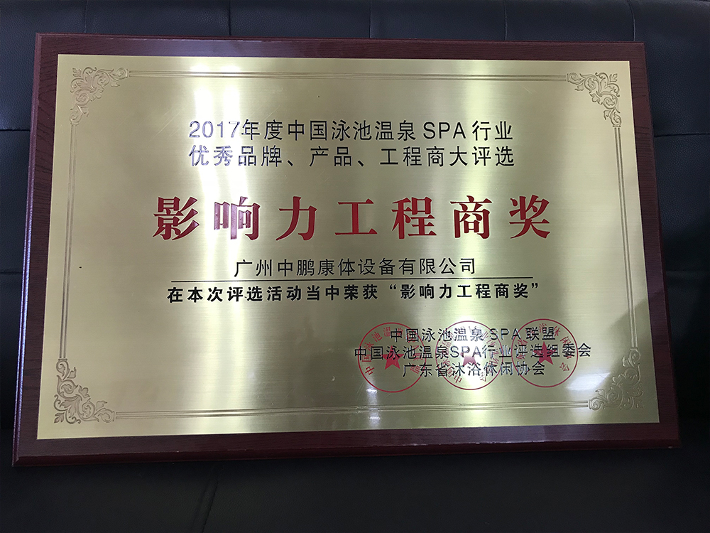 廣州中鵬康體設(shè)備有限公司榮獲——2017年度中國(guó)泳池溫泉SPA行業(yè)最高榮譽(yù)大獎(jiǎng)《影響力工程商獎(jiǎng)》