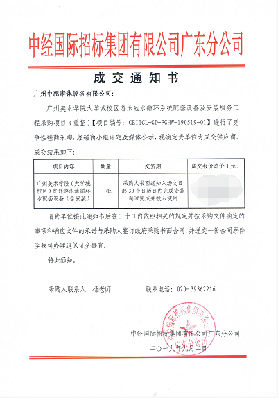 2019年9月2日,在這天從中經(jīng)國(guó)際招標(biāo)集團(tuán)有限公司獲悉,經(jīng)過(guò)激烈競(jìng)標(biāo),我司以絕對(duì)的優(yōu)勢(shì)中得廣州美術(shù)學(xué)院大學(xué)城校區(qū)游泳池水循環(huán)系統(tǒng)配套設(shè)備及安裝服務(wù)工程。