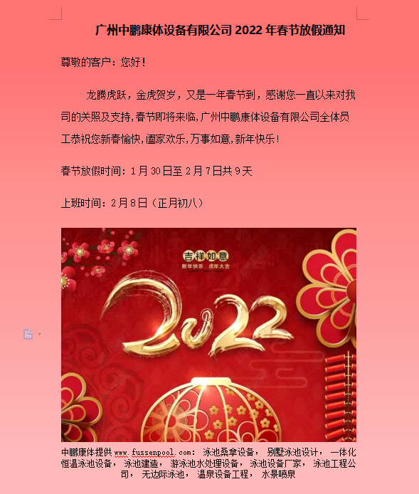 廣州中鵬康體設(shè)備有限公司2022年春節(jié)放假通知